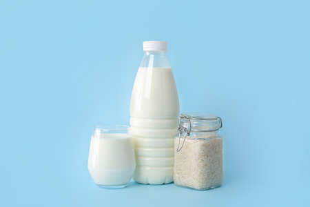 Bottle and glass of rice milk on color background
