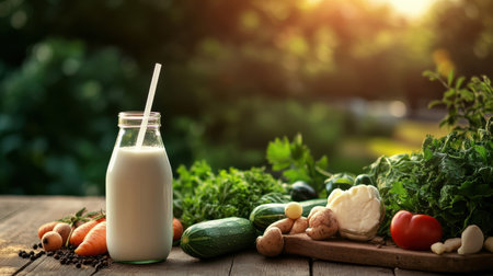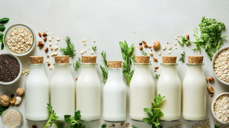 Explore an assortment of plant-based milk bottles surrounded by fresh ingredients, showcasing a healthy and eco-friendly lifestyle choice. Perfect for food photography.