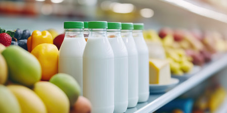 Brightly lit market shelf filled with an assortment of artisanal dairy products and fresh juices. The arrangement highlights a range of cheeses, milks, and natural beverages, inviting exploration.