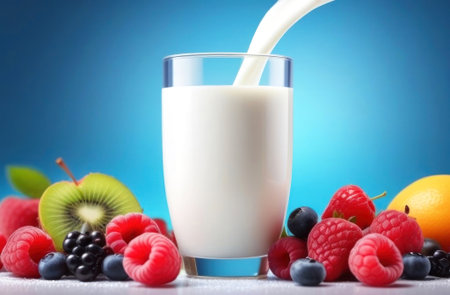 Indulge in a splash of freshness with this beautifully captured glass of milk surrounded by vibrant fruits. Perfect for healthy lifestyle inspiration. Generated AI.