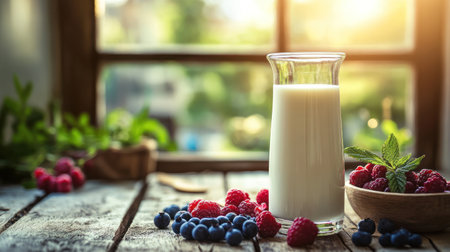 A glass of milk on rustic wooden table with fresh blueberries and raspberries in warm light of bright day
