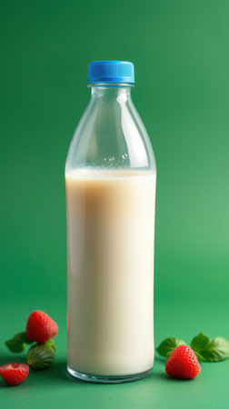 Fresh milk bottle with ripe strawberries on a green background showcasing a vibrant dairy scene