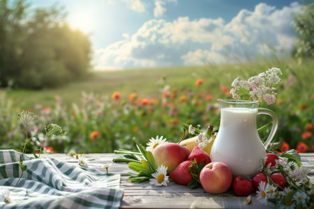 Milk jug with fresh fruits in a summery field - organic dairy products and healthy eating concept