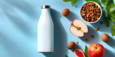 Bottle of milk with granola, apples, figs, and walnuts arranged on a blue background in a healthy breakfast concept.