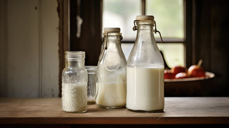 A stylish composition featuring fresh milk in a glass and a bottle, perfect for minimalistic kitchen decor. Ideal for healthy lifestyle themes.