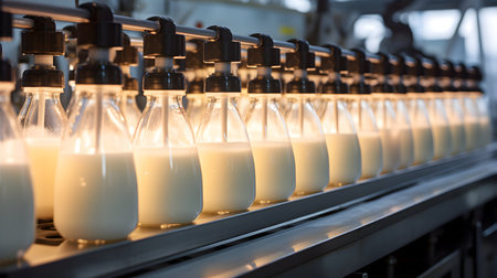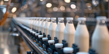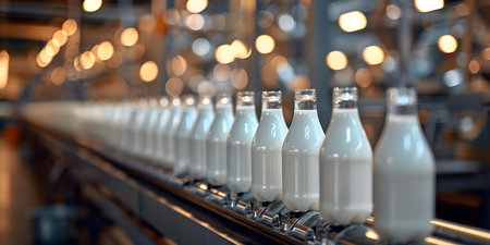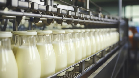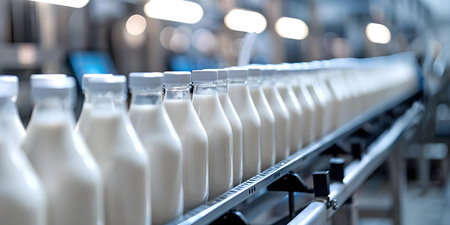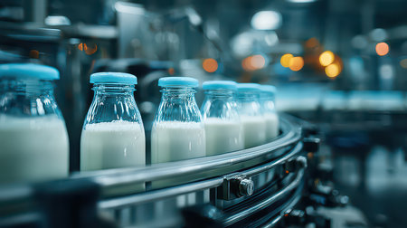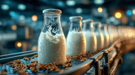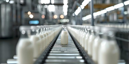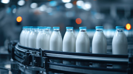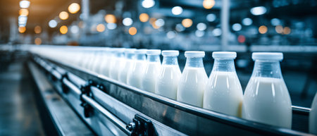 Rows of sparkling milk bottles glide along a stainless steel conveyor belt in a contemporary factory, illustrating the blend of technology and freshness.