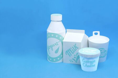 Various dairy products made of paper. Paper boxes and bottles with milk, yogurt, ice cream and cottage cheese. Paper art and craft. Volumetric handmade paper objects. Minimal healthy eating concept