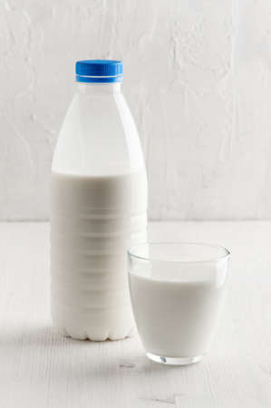 Closeup one bottle and one glass of fresh milk on the table. The benefits of milk