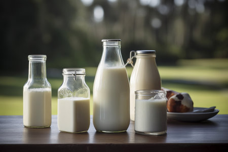 A collection of fresh milk bottles with wooden lids arranged on a kitchen table. This image captures the essence of healthy living and natural dairy products.