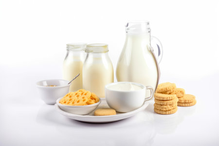 Dairy products on a white background. Milk, sour cream, cookies. Generative AI