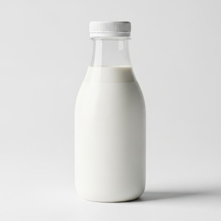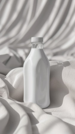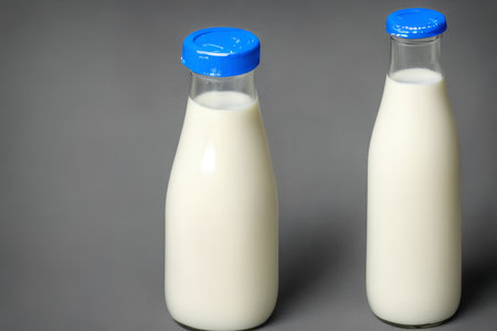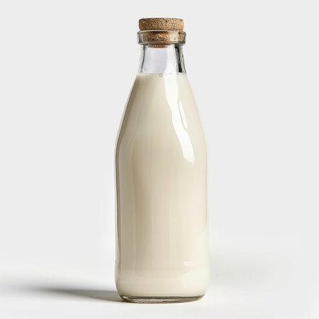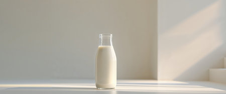 A glass bottle filled with fresh milk stands on a simple background, highlighting the natural essence of dairy. Ideal for culinary projects or health-focused themes.