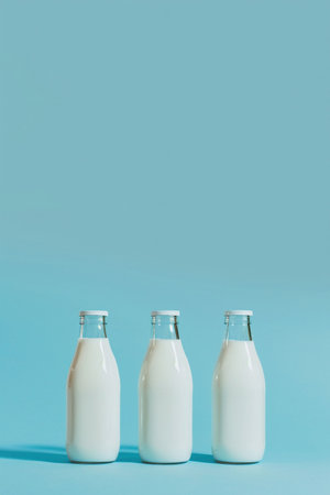 Three milk bottles in a row on a minimalist blue backdrop, capturing a clean, modern aesthetic.