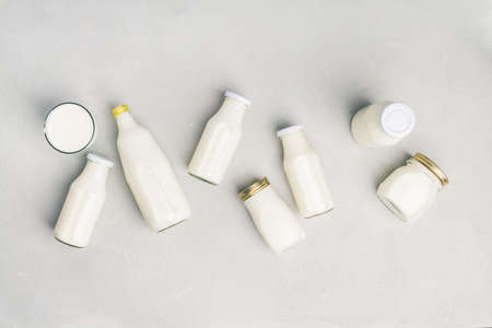 Milk bottles and milk jug over blue background. Modern still life composition. Healthy eating concept