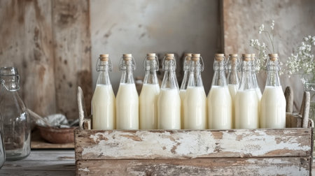 A vintage-inspired dairy crate with glass bottles of fresh milk, showcasing a simple and wholesome farm aesthetic
