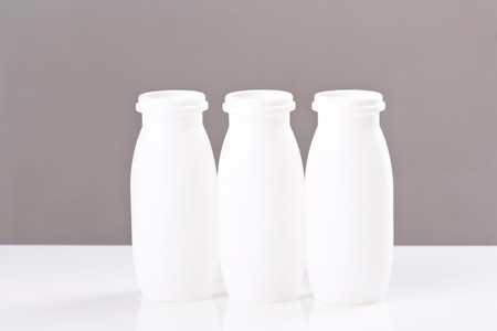 Bottles with probiotics and prebiotics dairy drink on light blue background. Bio yogurt with useful microorganisms. Production with biologically active additives. Fermentation and diet healthy food.