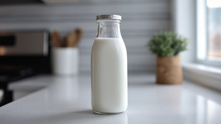 A stylish composition featuring fresh milk in a glass and a bottle, perfect for minimalistic kitchen decor. Ideal for healthy lifestyle themes.