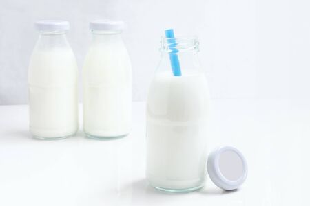 Three glass bottle of milk and blue suck straws on a white table background for food healthy concept with copy space for text.