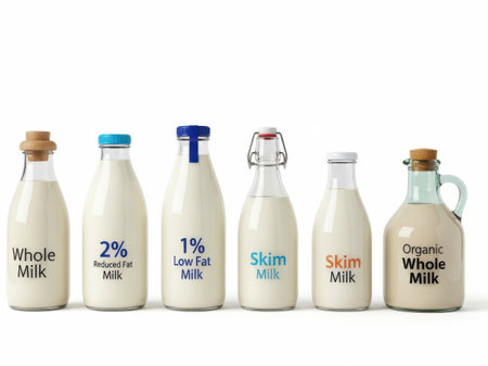 This image shows a collection of different types of milk bottles, each labeled with a specific type of milk. The bottles include Whole Milk, 2% Reduced Fat Milk, 1% Low Fat Milk, Skim Milk, and Organic Whole Milk. Each bottle has a distinct design and color cap, making it easy to differentiate between the varieties.