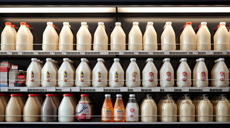 A row of identical milk cartons without labels arranged neatly on a supermarket shelf
