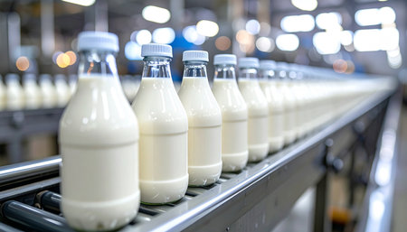 A modern milk production facility showcasing bottles of fresh milk traveling on a conveyor belt, emphasizing efficiency and stringent quality controls in dairy processing.