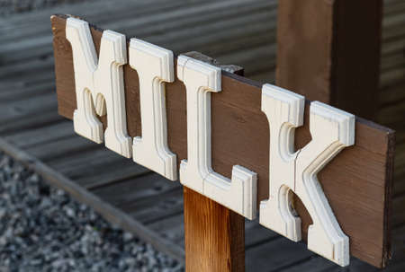 Wooden board with word milk. Signboard with directions for buying milk. White Milk writing with letters on dark background. Selective focus, nobody