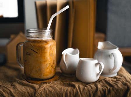A glass of iced milk tea on wood plate