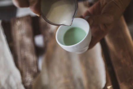 Woman is pouring milk into her tea.