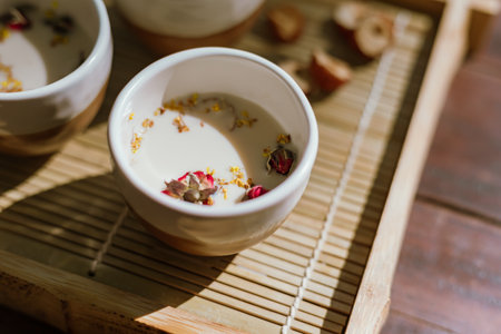Chinese tea ceremony with ceramic cups with milk Oolong tea on wooden background. Traditional Asian drink, beautiful serving
