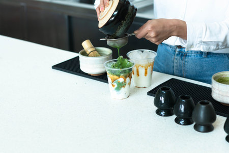 Barista making iced matcha latte in coffee shop.