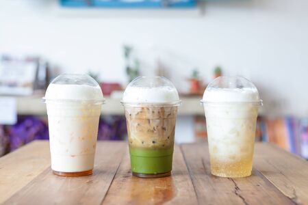 Iced milk drinks in white coffee shop, stock photo