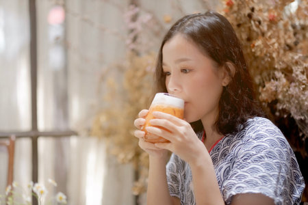 Asian girl drinking a glass of milk tea in cafe