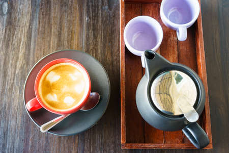 Coffee and tea on wooden plate.