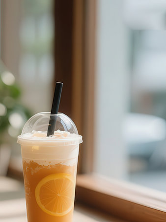 Milk ice tea in takeaway plastic cup on table in cafe, Thailand
