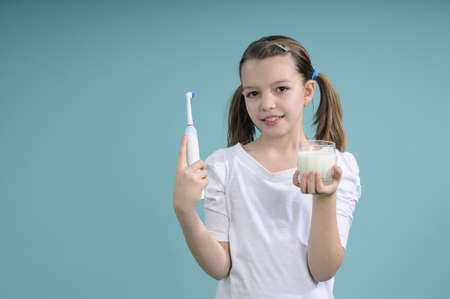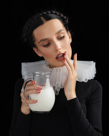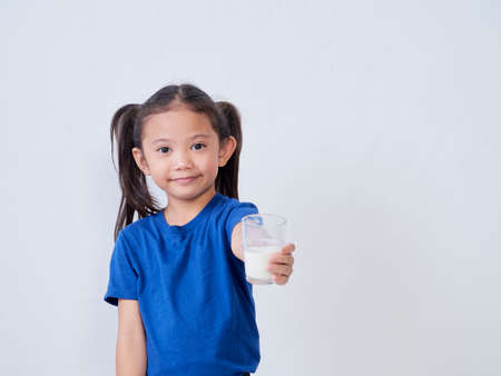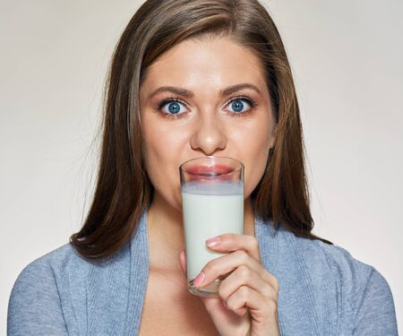 Teenage girls holding a glass of milk in hand and points a finger at milk while standing on white background.