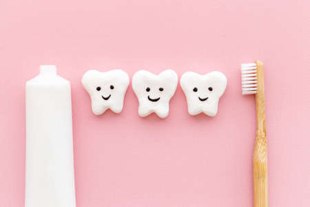 Plaster model of the jaw with a bamboo natural toothbrush and environmental toothpaste. Teeth care. Oral care. Blue background