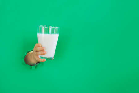 Hand of the child is holding glass of milk inserted through a hole in torn green paper. Copy space.