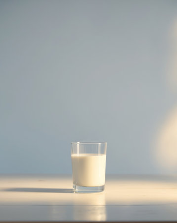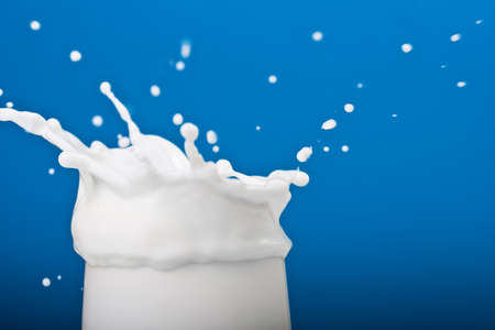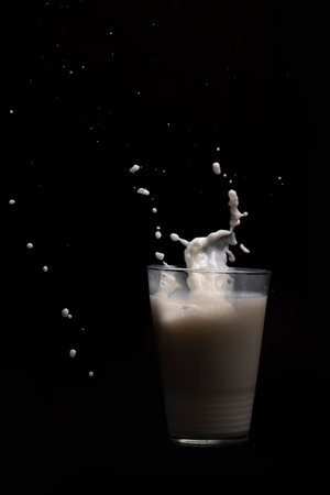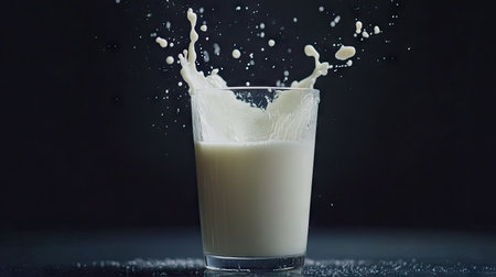 Fresh glass of milk on a dark background with milk splashing over the rim, capturing a playful and energetic feel