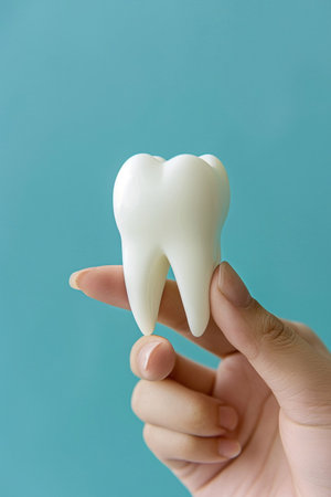 A single hand holding a flawless white tooth model, isolated against a blue background, representing oral health.