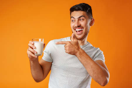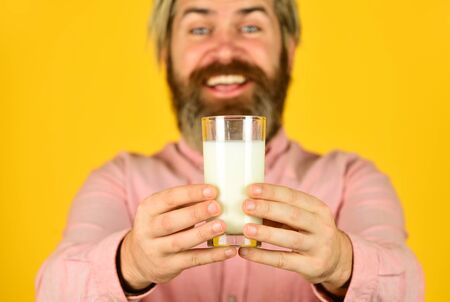 Milk for good health. Lactose free. Bearded man hold glass of milk. Source of calcium. Vegan milk concept. Drink protein cocktail. Healthy habits. Almond milk is rich in several healthy nutrients