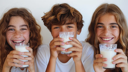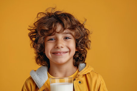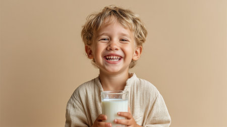 A joyful boy with curly hair smiles widely while holding a glass of milk against a soft beige background. This image captures happiness and innocence, perfect for child-centric themes.