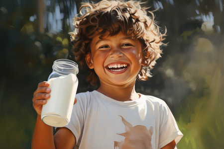Portrait of a little boy holding a bottle of milk and smiling, Perfect kids smile with a happy boy displaying a beautiful white milk toothy smile, AI Generated