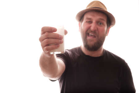 a satisfied man with a beard in a hat held out his hand forward in it a glass of milk product the background is white. man out of focus