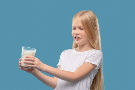 blonde young woman in pink blouse holding a glass of milk on blue background