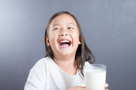 Asian little cute kid holding a cup of milk in the house. feel happy and enjoy drinking milk.