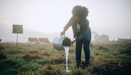 Farmer dumping milk into a field, peaceful village and green landscape