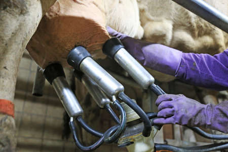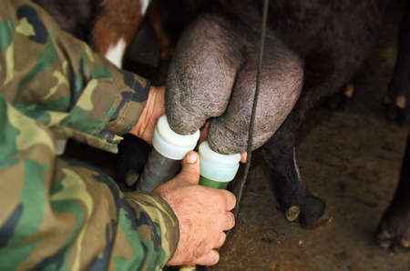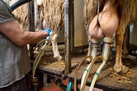 Milking milk from cows, with milking tools.