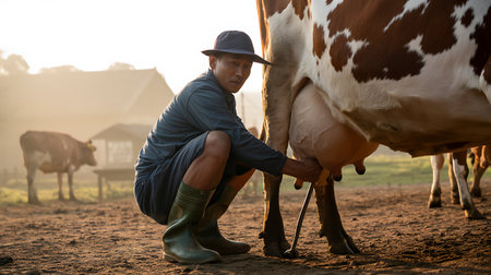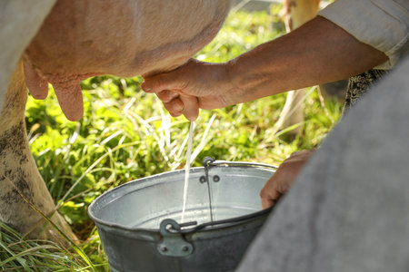 Farmer hands manually milking a cow, producing fresh milk into a rustic metal bucket on a dairy farm