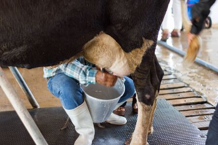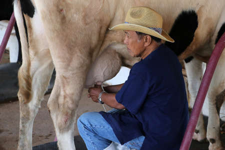 Muak Lek, Saraburi Thailand - Dec 27, 2019 : The man milking cows from cow's breast to aluminum cans by the hand of farmers who raise animals.