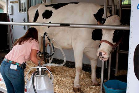 Forest Park, GA, USA - July 27, 2013: A cow reacts to being hooked up to a milking machine as part of an educational display at the Georgia Grown Farmers Showcase at the Atlanta Farmers Market.