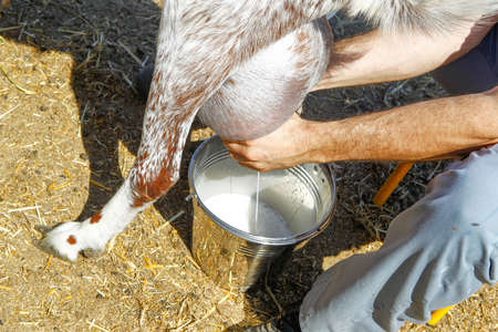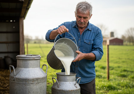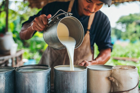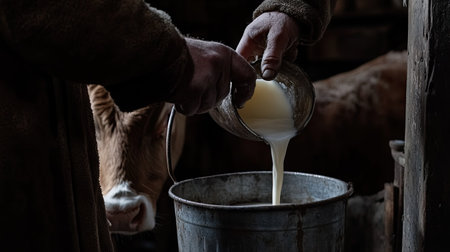 Farmer's hands holding container, pouring goat milk into rustic metal bucket, symbolizing natural farming and rural work